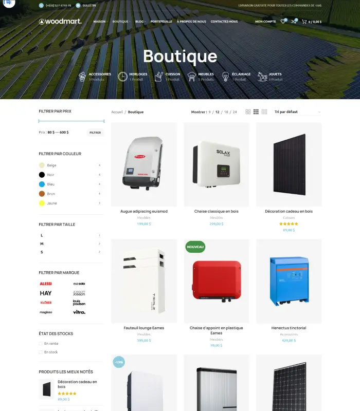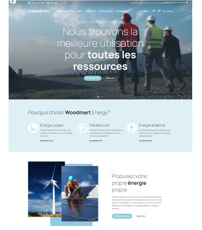Le site web ÉnergieWood, basé sur le thème WoodMart, est une solution polyvalente pour les entreprises opérant dans le secteur des énergies renouvelables. Il combine une vitrine professionnelle pour mettre en avant vos services et expertises, avec un catalogue e-commerce performant pour présenter et vendre vos produits solaires.